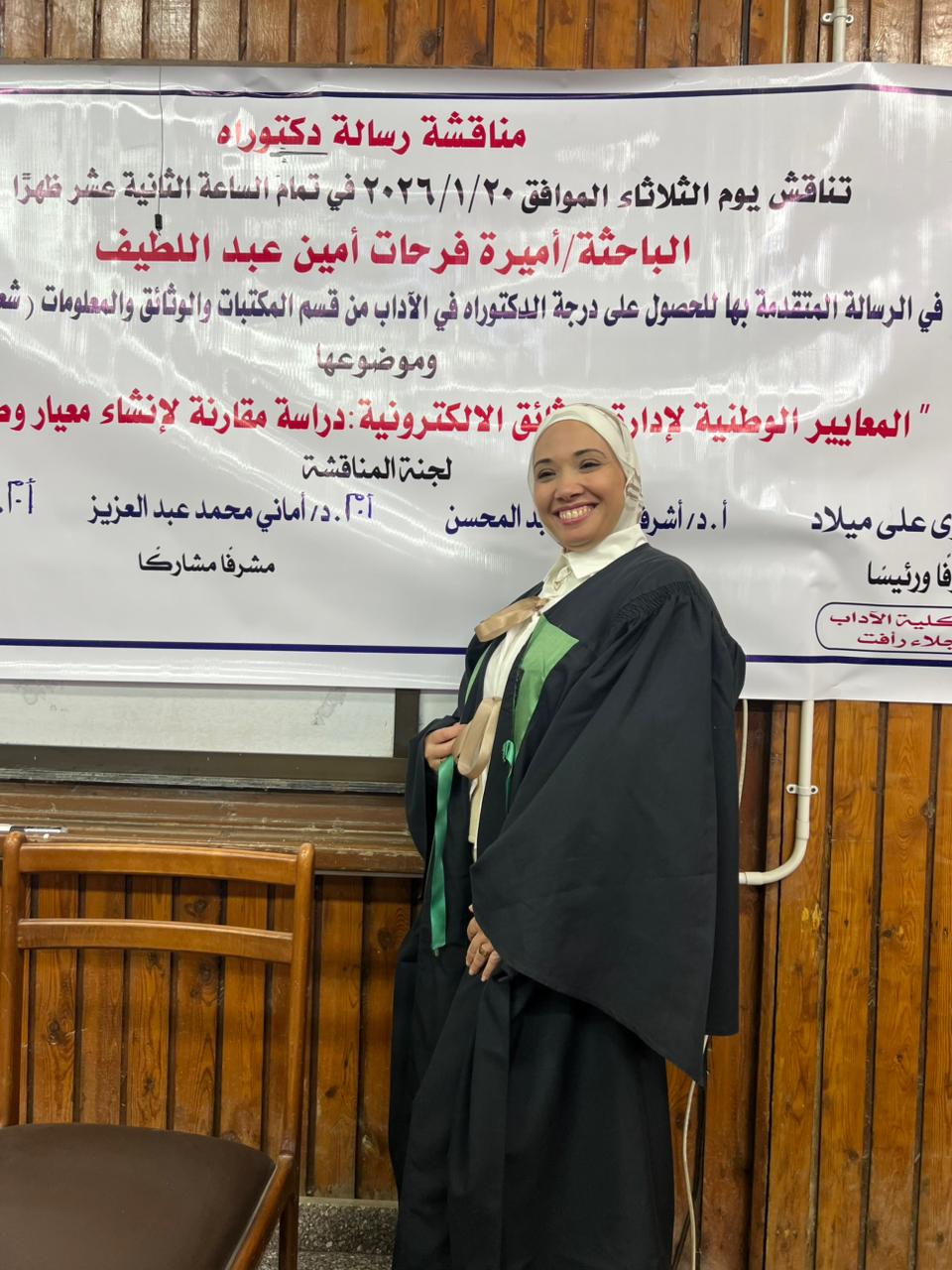 حصول الدكتورة أميرة فرحات على درجة الدكتوراه بدرجة امتياز مع مرتبة الشرف، في قسم المكتبات والوثائق والمعلومات، بعد مناقشة رسالة علمية متميزة تناولت موضوع إدارة الوثائق الإلكترونية، بعنوان: