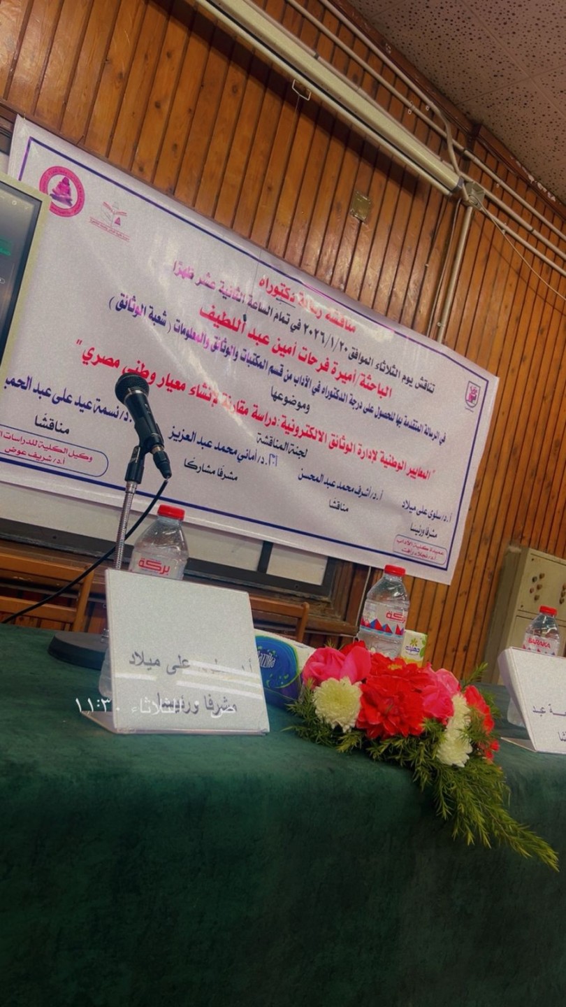 كما أشاد أعضاء هيئة التدريس بالقسم بالدقة العلمية والمنهجية المحكمة التي اتبعتها الدكتورة فرحات في إعداد رسالتها، مشيرين إلى أن بحثها يمكن أن يكون مرجعًا مهمًا للمؤسسات الحكومية والخاصة، ويساعد في تطوير البنية التحتية الرقمية للمكتبات والأرشيفات المصرية.